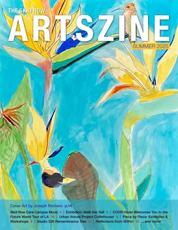 The Skid Row Arts Zine is for you, the members of Skid Row community. Our goal is to encourage and engage your creative spirit by providing safe spaces and opportunities for you to create and thrive. We invite you to a short survey about what you enjoy and would like to see in the Arts Zine.
